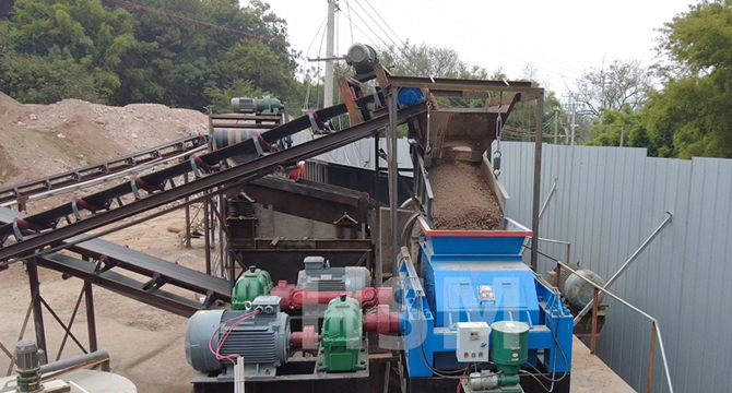 雲(yun)母(mu)鑛(kuang)生産(chan)線(xian)配(pei)備兩(liang)檯(tai)對(dui)輥破碎(sui)機(ji)咊(he)一檯(tai)振動(dong)篩分設備(bei)